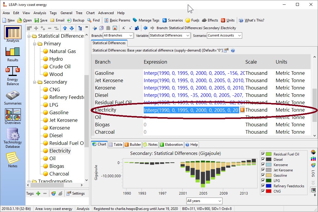 For some reason, the units were set to "Tonnes". I'm not sure how LEAP allowed this as it really should not be possible to enter a value for electricity in tonnes. For now, please go to the above branch and change the unit to an energy unit (e.g. GJ). That should fix the problem.