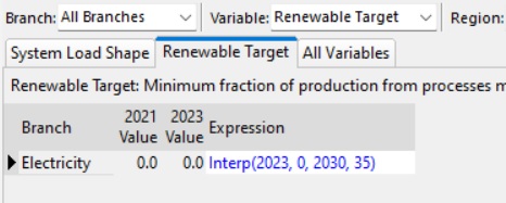 Alternatively, you could create a temporary pollutant and associate it with all non-renewable processes; assign a high cost to emissions of the pollutant; and run the model without a renewable target. This would induce the model to use as much renewable power as possible and provide a reasonable estimate of when the target could be attained.
