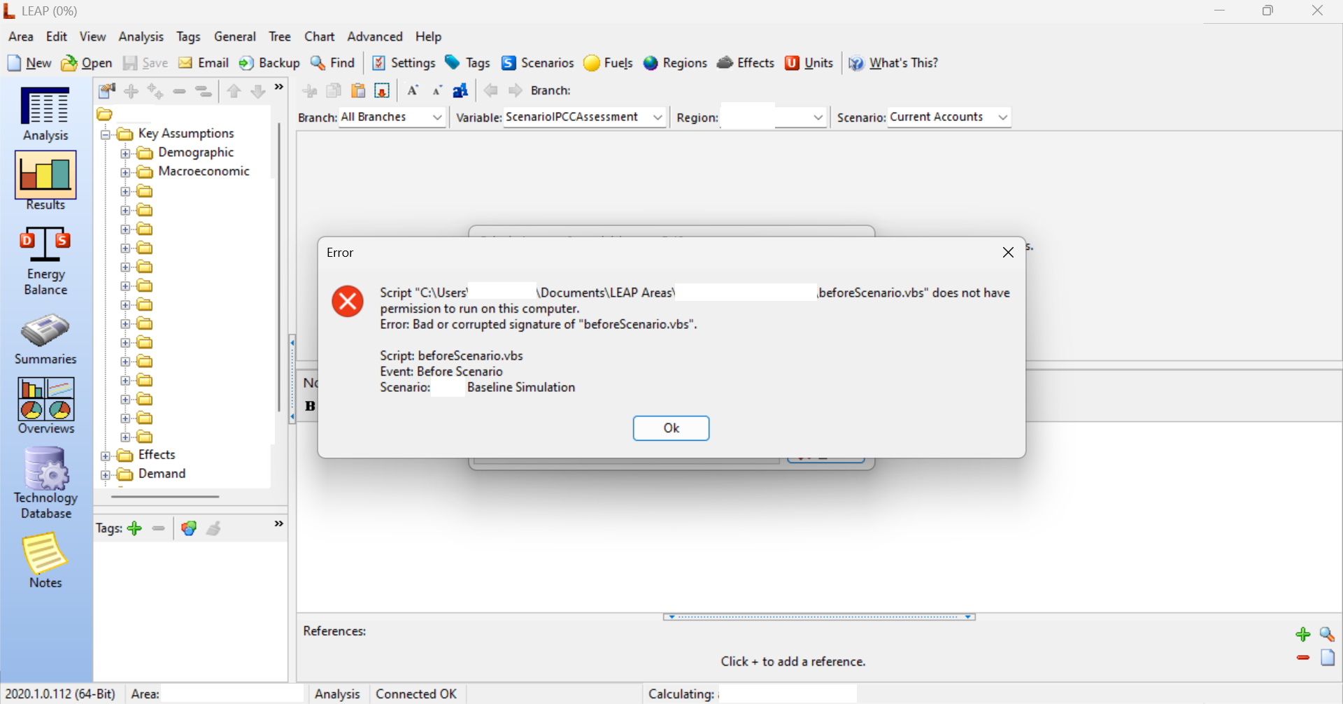 I am trying to run Results on an existing LEAP file, and I got many pop-up errors: "script ........vbs does not have permission to run on this computer".